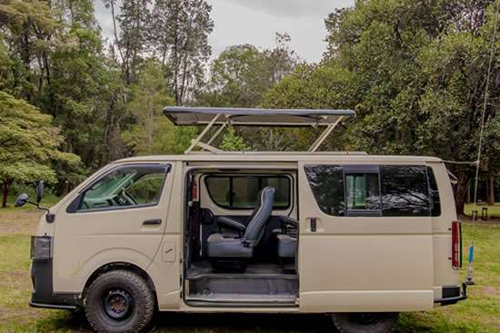 A safari van is good when you are travelling in groups of families its spcious and large enough for passengers with their luggage. One of its biggest pros while in a safari is a pop up roof which can be opened at any time t giving tourists uninterrupted views during gme drives.